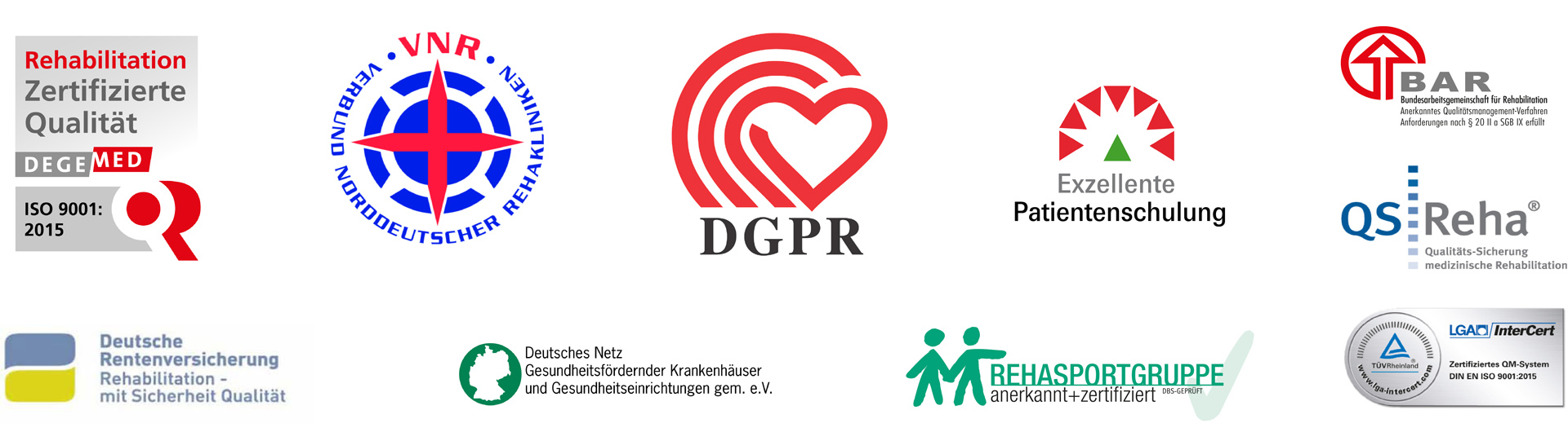 Für das Gesamtunternehmen erfüllen wir die Kriterien der DIN EN ISO 9001:2015, für die präventiven und rehabilitativen Bereiche gleichzeitig auch diejenigen der Deutschen Gesellschaft für Medizinische Rehabilitation e. V. (DEGEMED) und der Deutschen Gesellschaft für Prävention und Rehabilitation e. V. (DGPR). Die grundsätzlichen Anforderungen an ein einrichtungsinternes Qualitätsmanagementsystem nach § 37 Sozialgesetzbuch Neuntes Buch (SGB IX) übertreffen wir bei weitem.